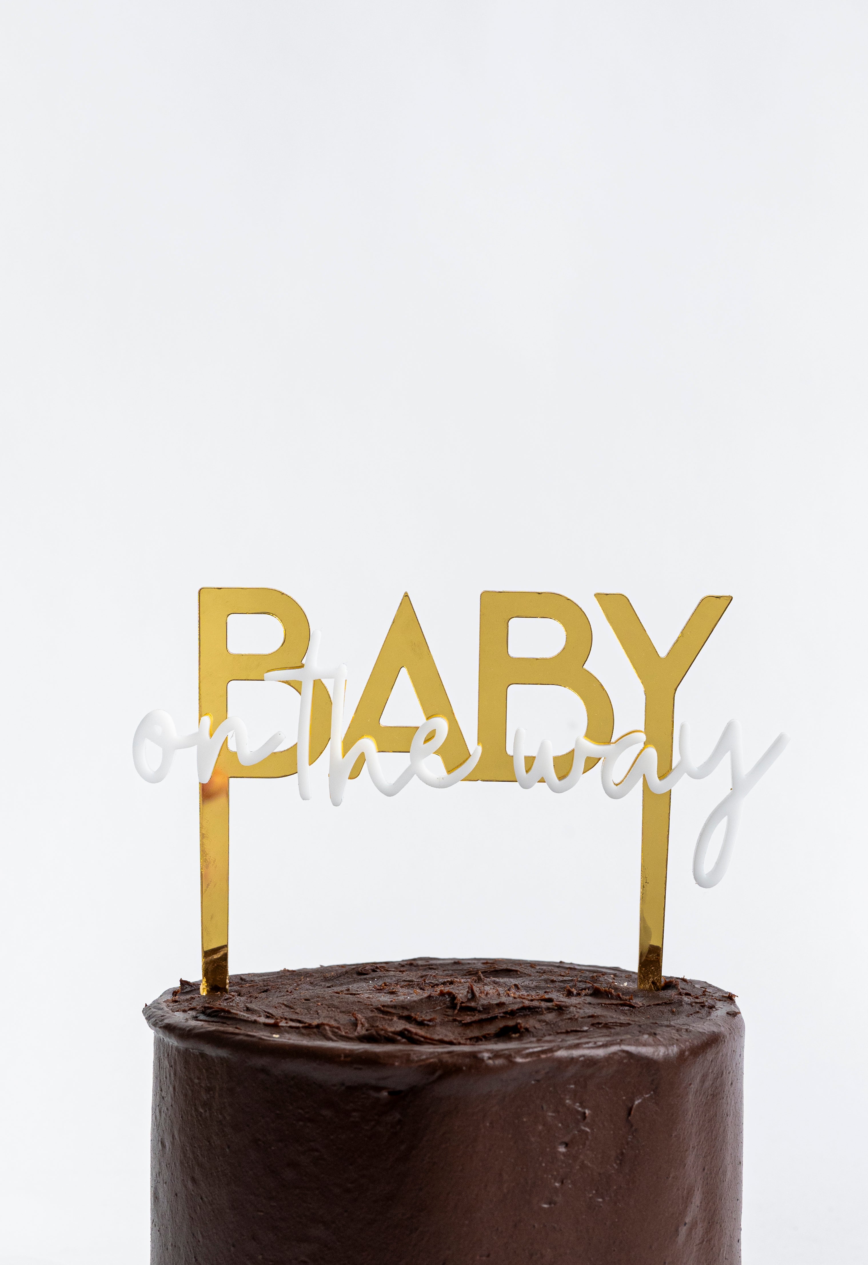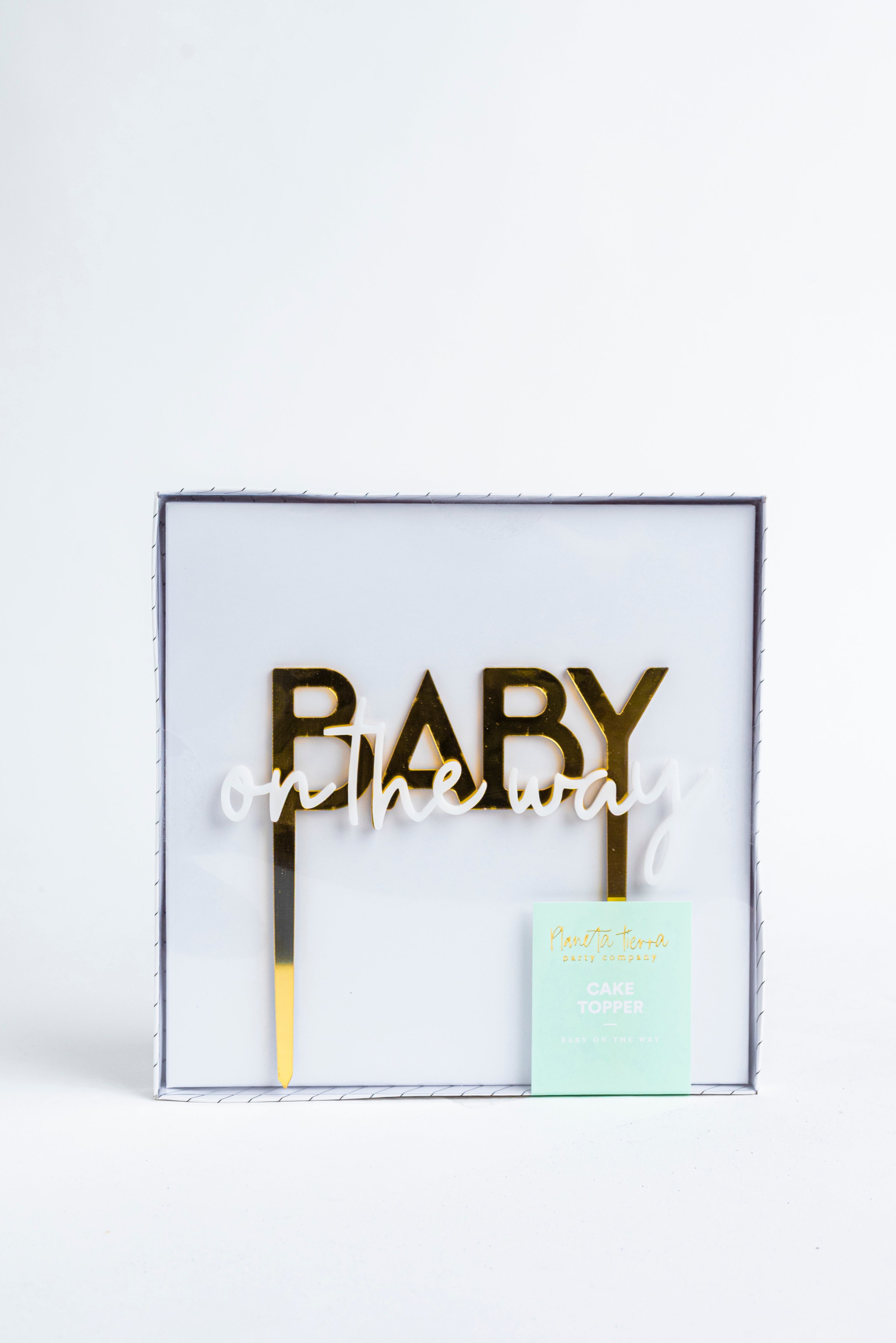 Cake topper de acrílico dorado y blanco "Baby on the way". Medida: 170x160mm.